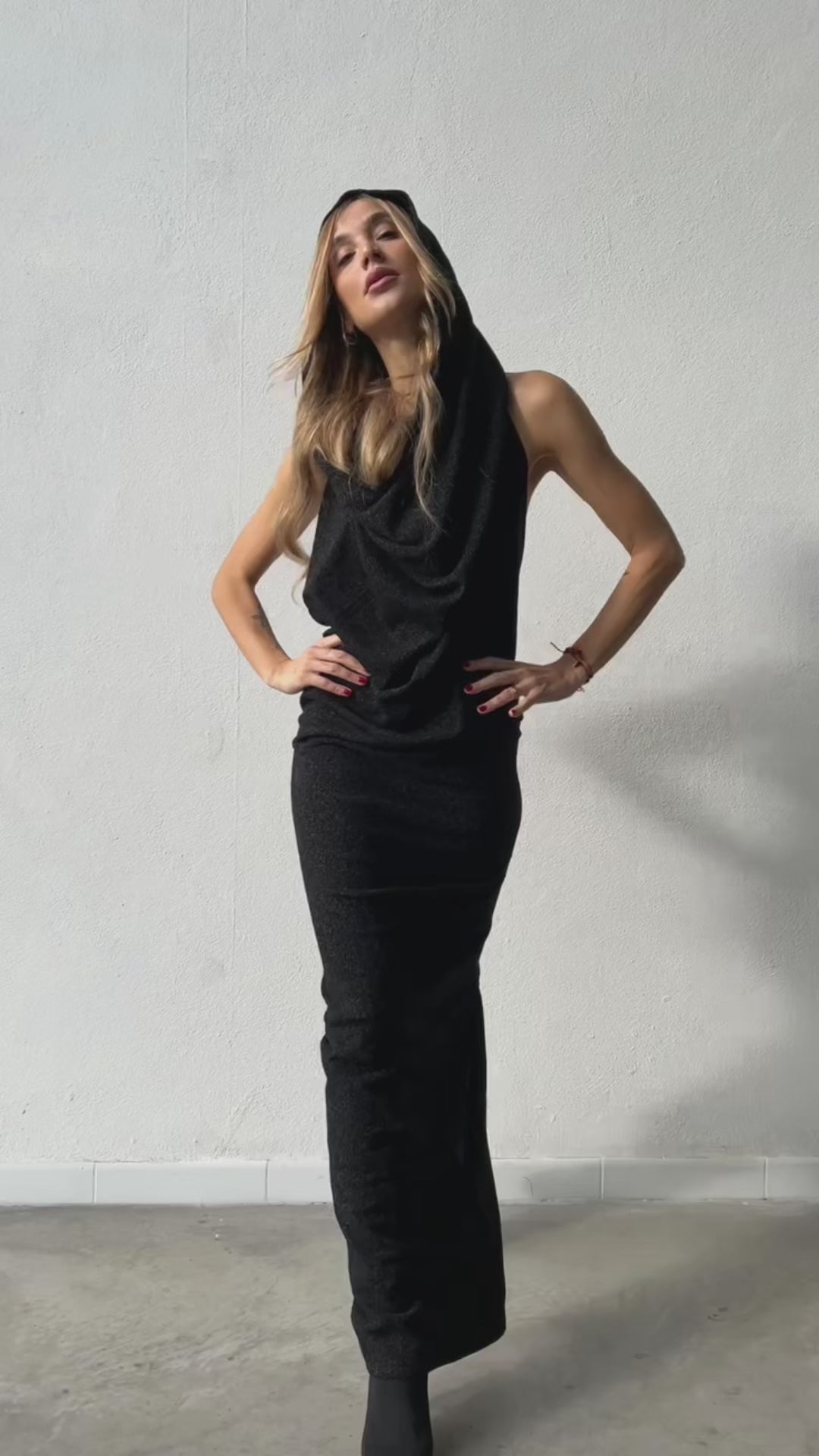 P6164 ABITO LUNGO CON CAPPUCCIO SCHIENA NUDA LUREX NERO