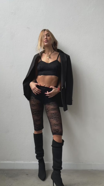 Crop top in pizzo nero con spalline sottili ,sensuale ed elegante perfetto per chi cerca comfort e femminilità. Realizzato interamente in pizzo, lega trasparenza e raffinatezza, la parte anteriore foderata. Il design privo di ferretti per garantire leggerezza e comodità.