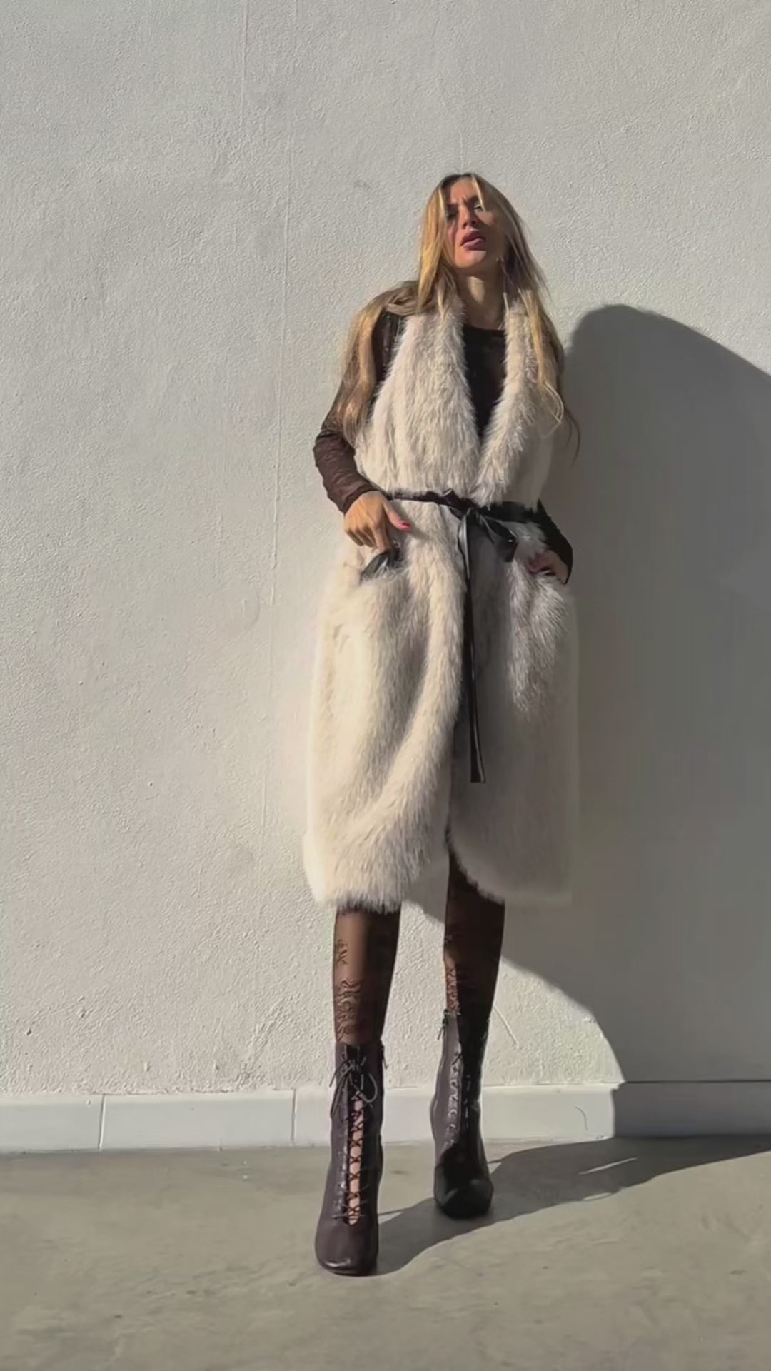 Gilet smanicato con rifiniture ecopelle marrone in ecopelliccia panna con tasche sulla parte anteriore e cintura in ecopelle marrone