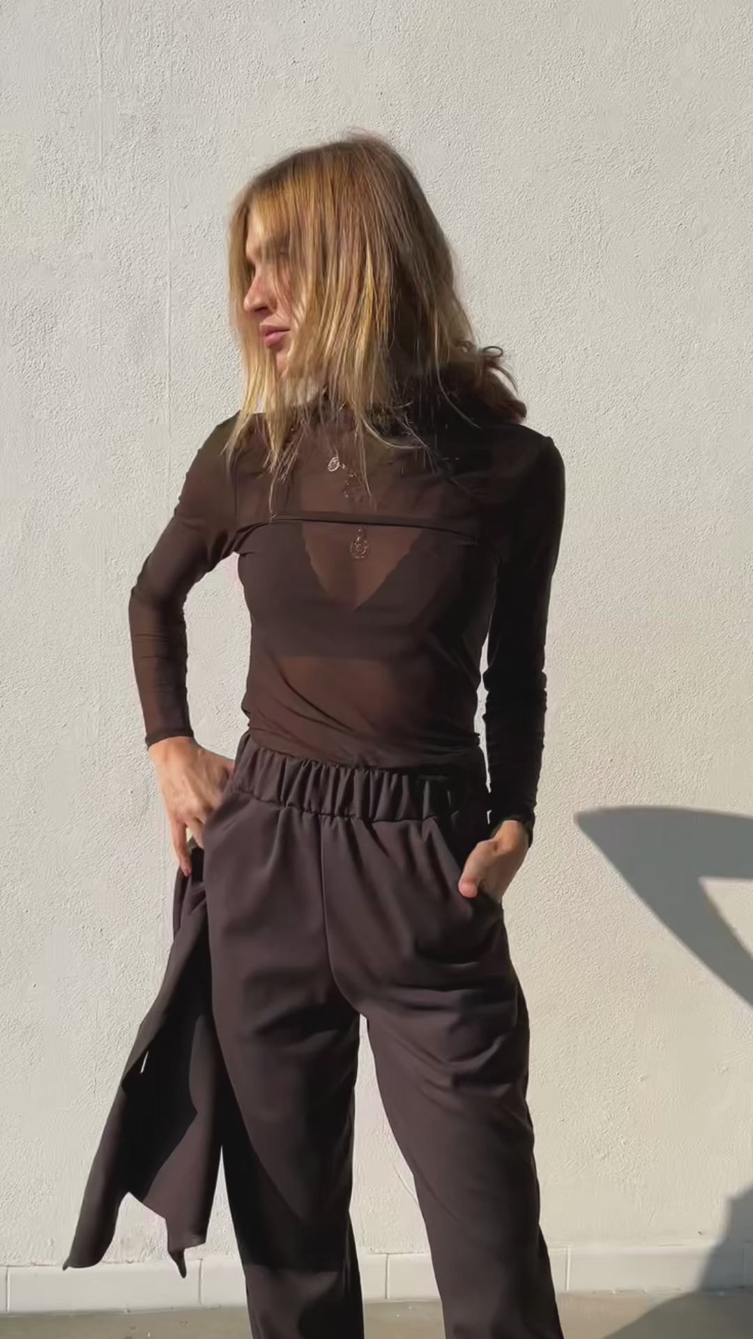 Lupetto collo alto con maniche lunghe in tulle marrone