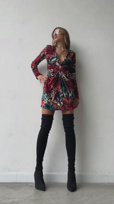 Abito midi a maniche lunghe con nodo sulla parte anteriore ,scollo a v, tessuto morbido ciniglia PAVONE ROSSO