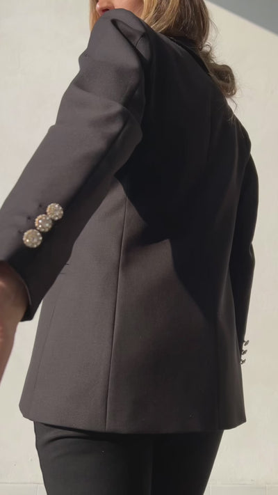 Giacca con colletto chiusura con bottoni gioiello, ha bottoni gioiello anche nella chiusura polsi, spalline imbottite