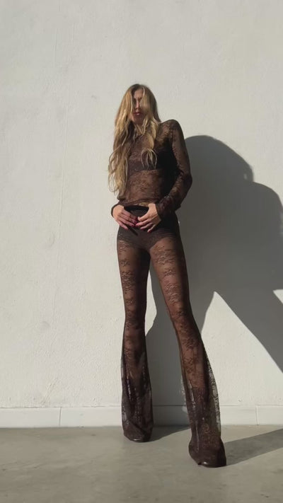 Maglio scollo tondo maniche lunghe aderente con tessuto elasticizzato pizzo marrone