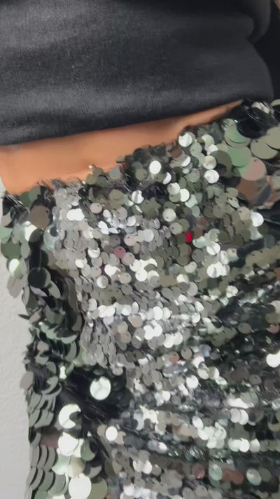Minigonna a vita alta in maxi paillettes piombo con elastico in vita, un capo perfetto per brillare con stile durante le tue serate, party o eventi speciali. Realizzata in tessuto decorato con paillettes scintillanti, cattura la luce a ogni movimento, donando un effetto luminoso e sofisticato. L'elastico in vita garantisce una vestibilità comoda e versatile, adattandosi perfettamente alla silhouette senza rinunciare allo stile.