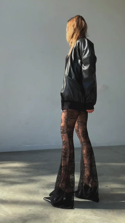 Pantaloni a vita alta con elastico in vita in tessuto elasticizzato pizzo nero a zampa